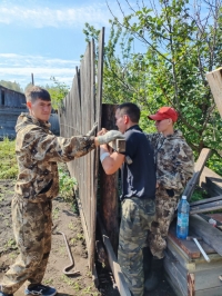 Команда волонтеров вместе с педагогом отправились к бывшей сотруднице интерната Светлане Ефимовне У., чтоб помочь ей убрать слетевший шифер, поднять забор и собрать ветки от деревьев.